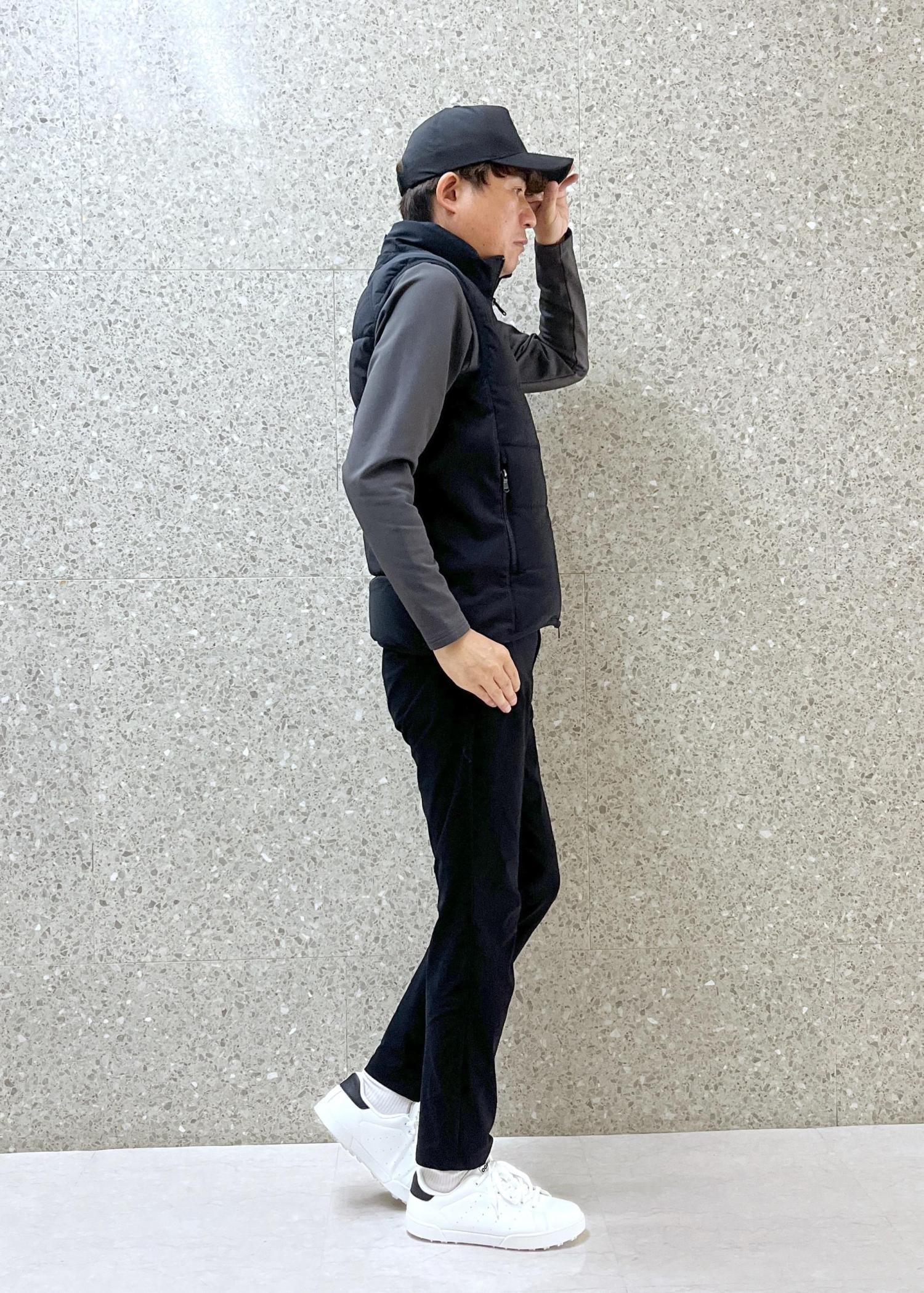 防寒トップスを合わせ、軽さと暖かさを両立。