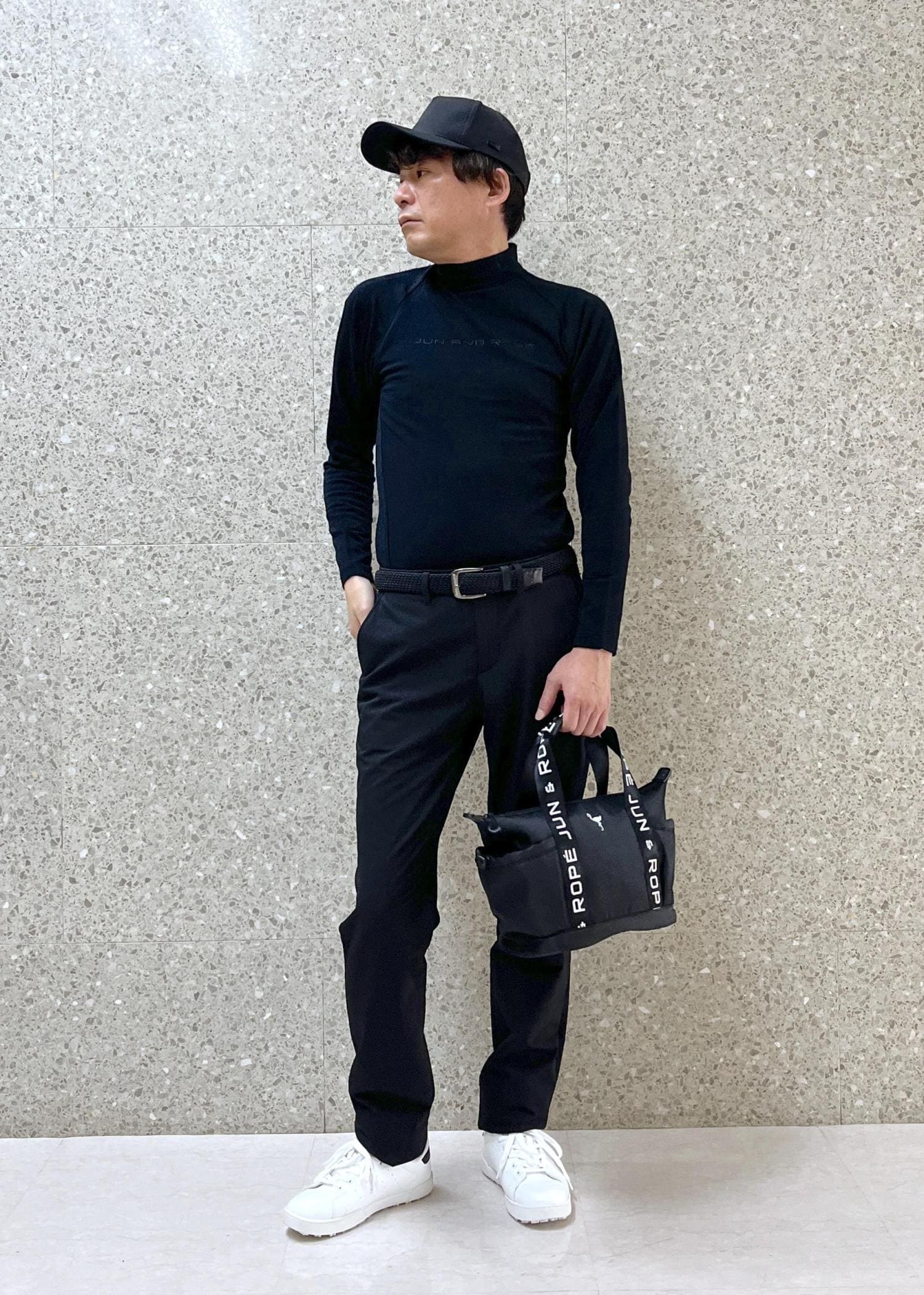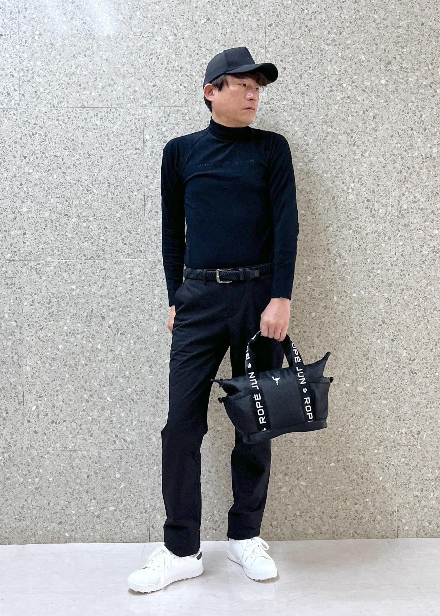 バッグとキャップもブラックで統一し、