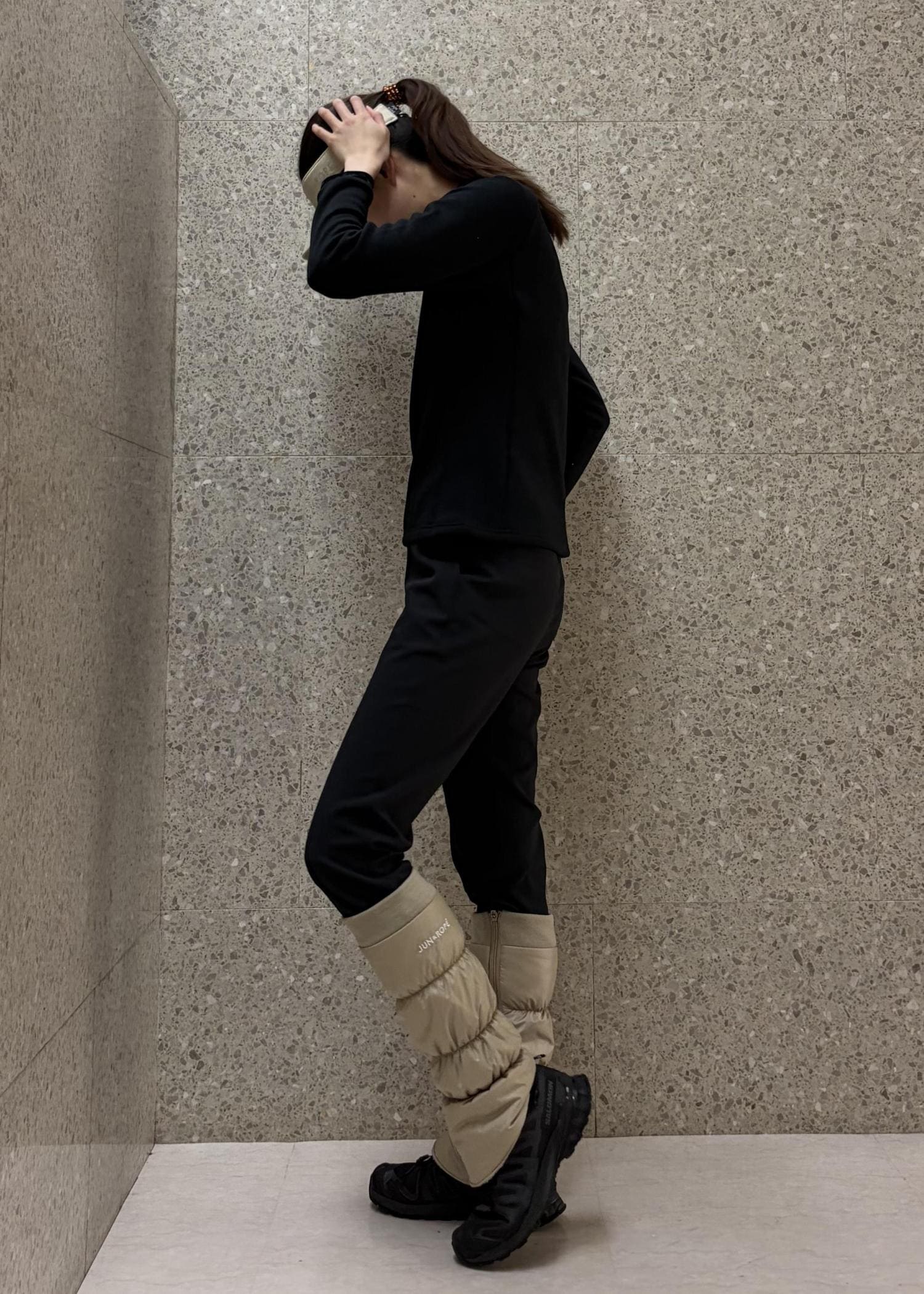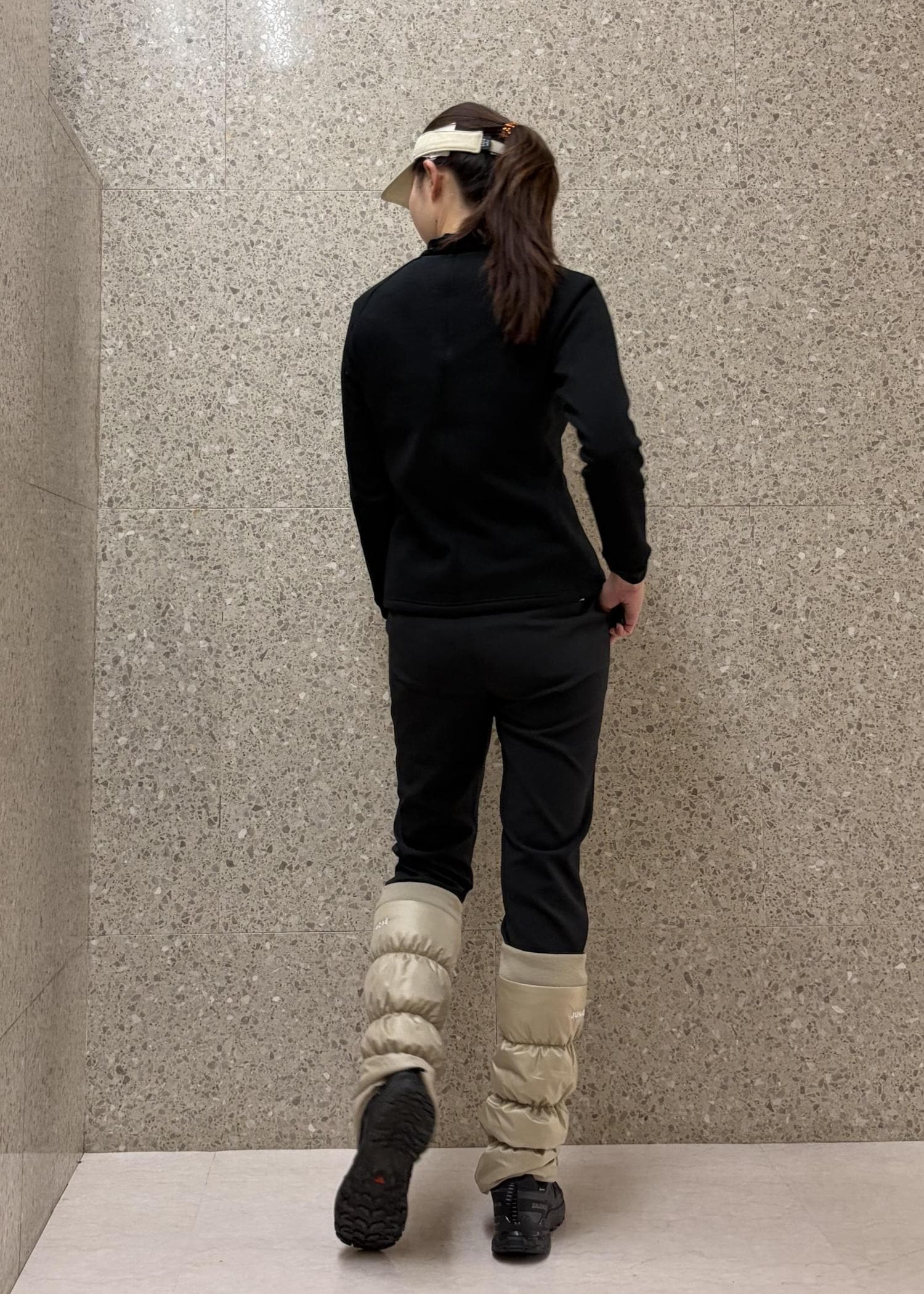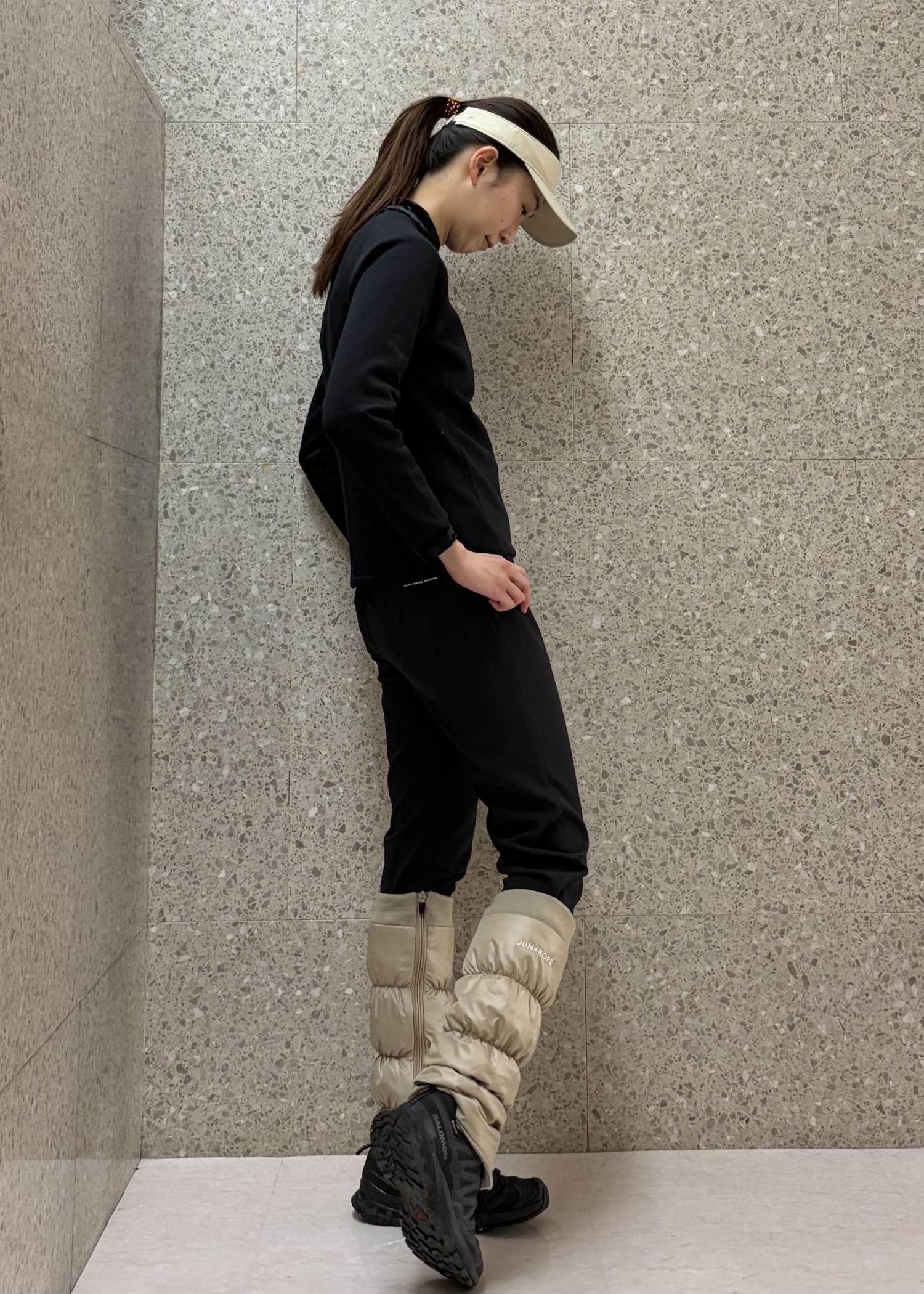 Jun & Ropé中わたレッグウォーマー/撥水・防風ベージュ / F¥13,200レビュー内側にアジャスターがあり、着るボトムに合わせて調整可能。