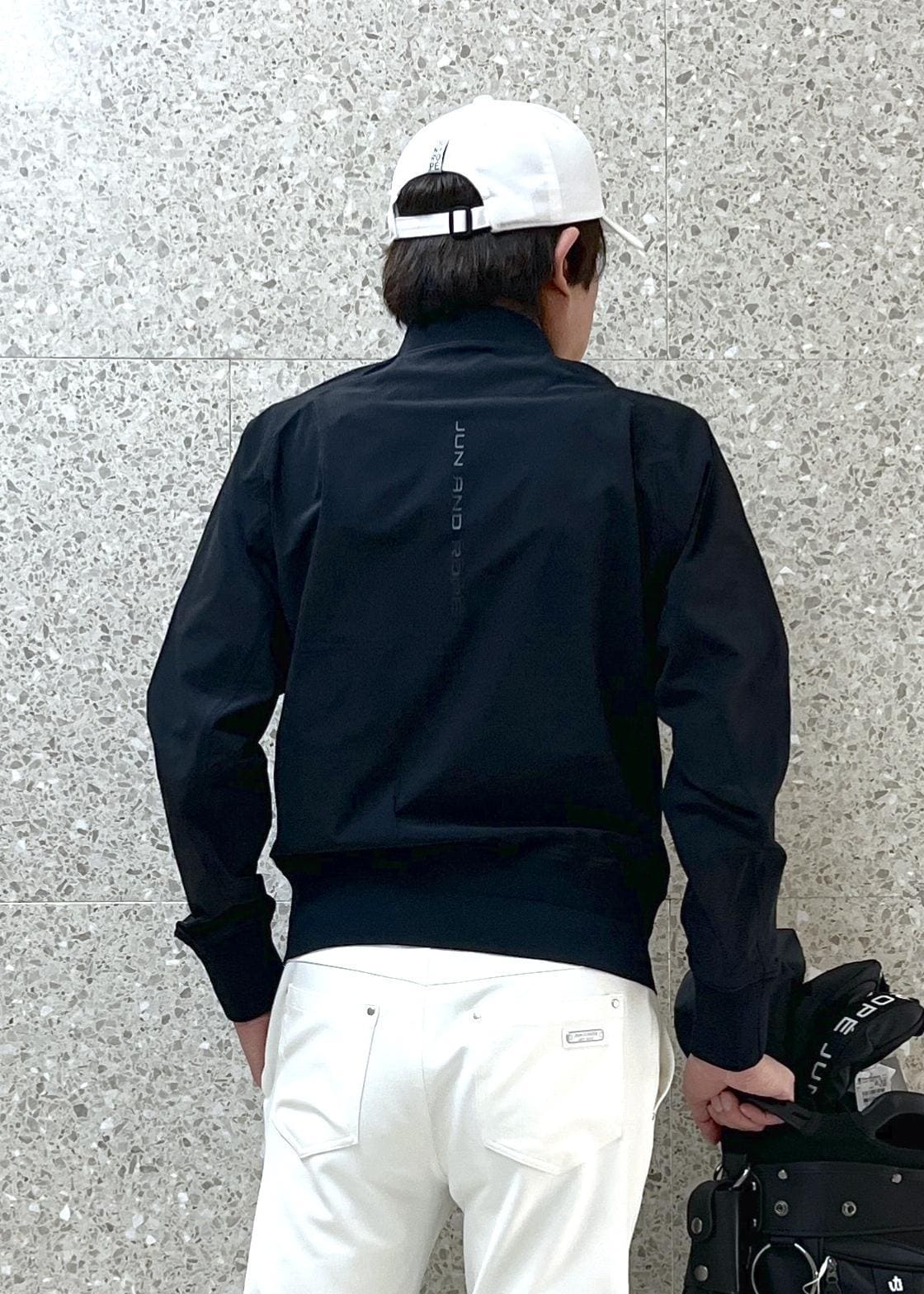 白のキャップとブラックのキャディバッグを合わせ、