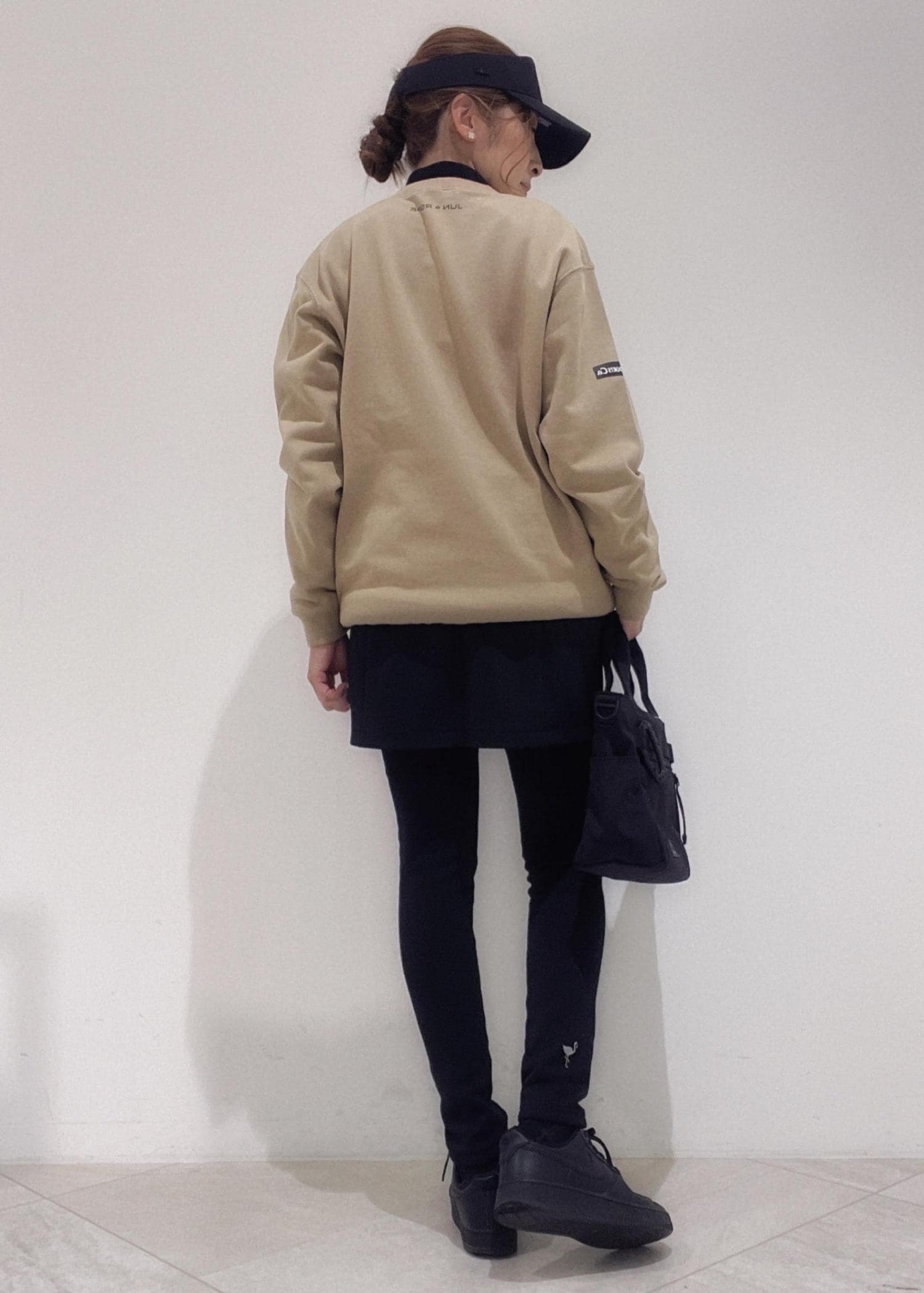 フロントにJONESモチーフの立体刺繍、両袖と後見頃にプリントモチーフを配した、カジュアルにも着用可能な万能ベーシックトレーナーは、スッキリシルエットのタイトめスカートとコーディネート。