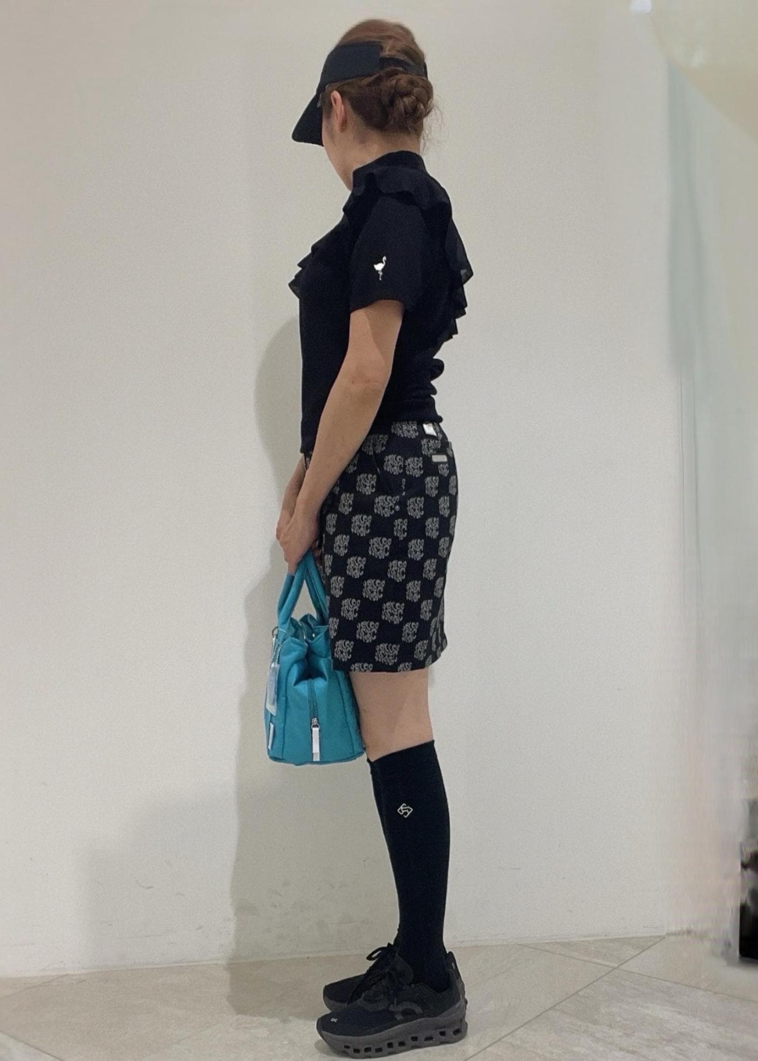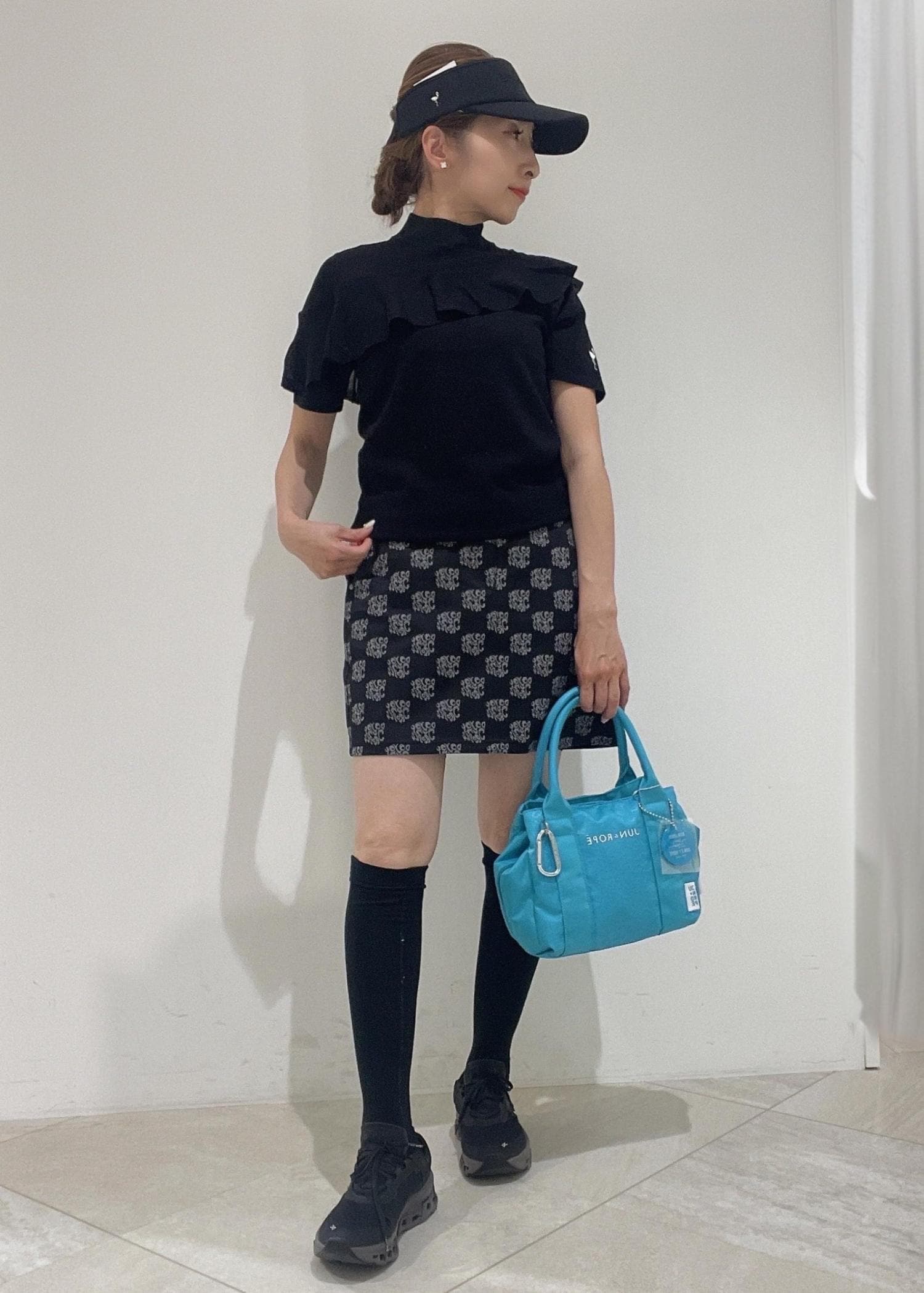 コーディネートしたサンバイザーでアクティブな印象を添え、甘さとスポーティーさのバランスが絶妙な仕上がりに。華やかさがありながら落ち着きもある、上品さを兼ね備えた洗練されたゴルフスタイルです。