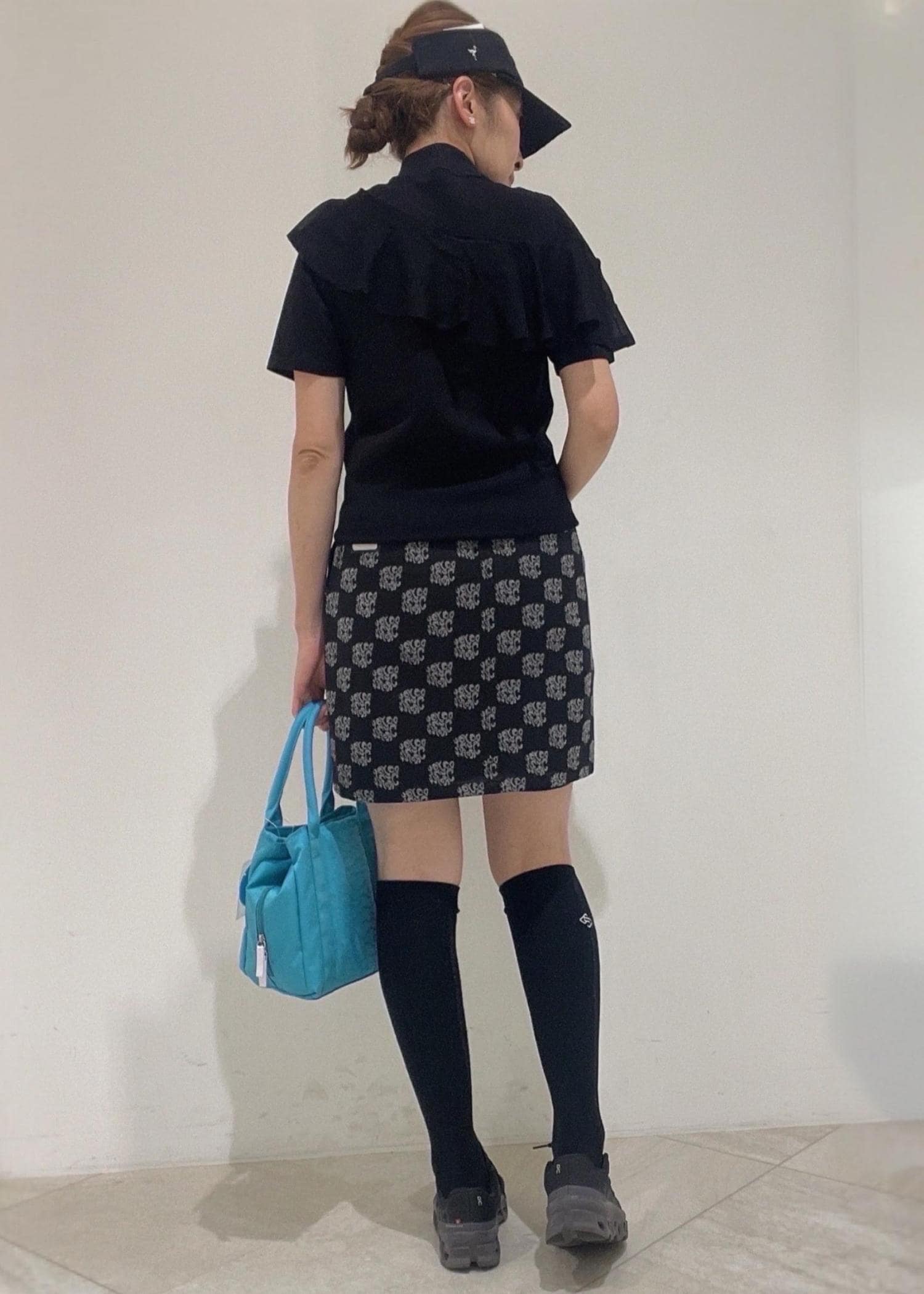 スカートはポリエステルコットンのオリジナルジャガード素材を使用。きれいなセミAラインシルエットで、格子風にデザインしたロゴグラフィックがアクセントになり、上品さの中に程よい存在感をプラスしています。