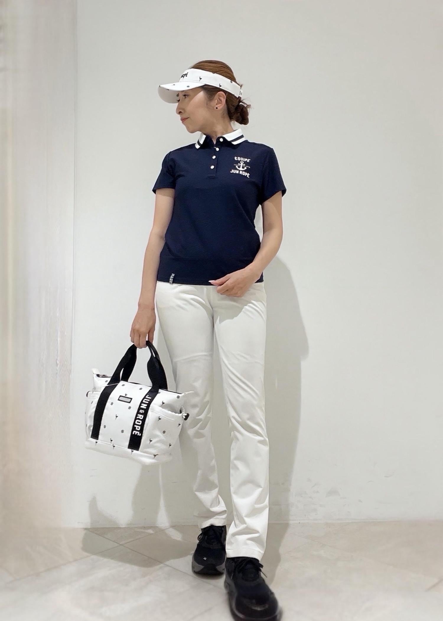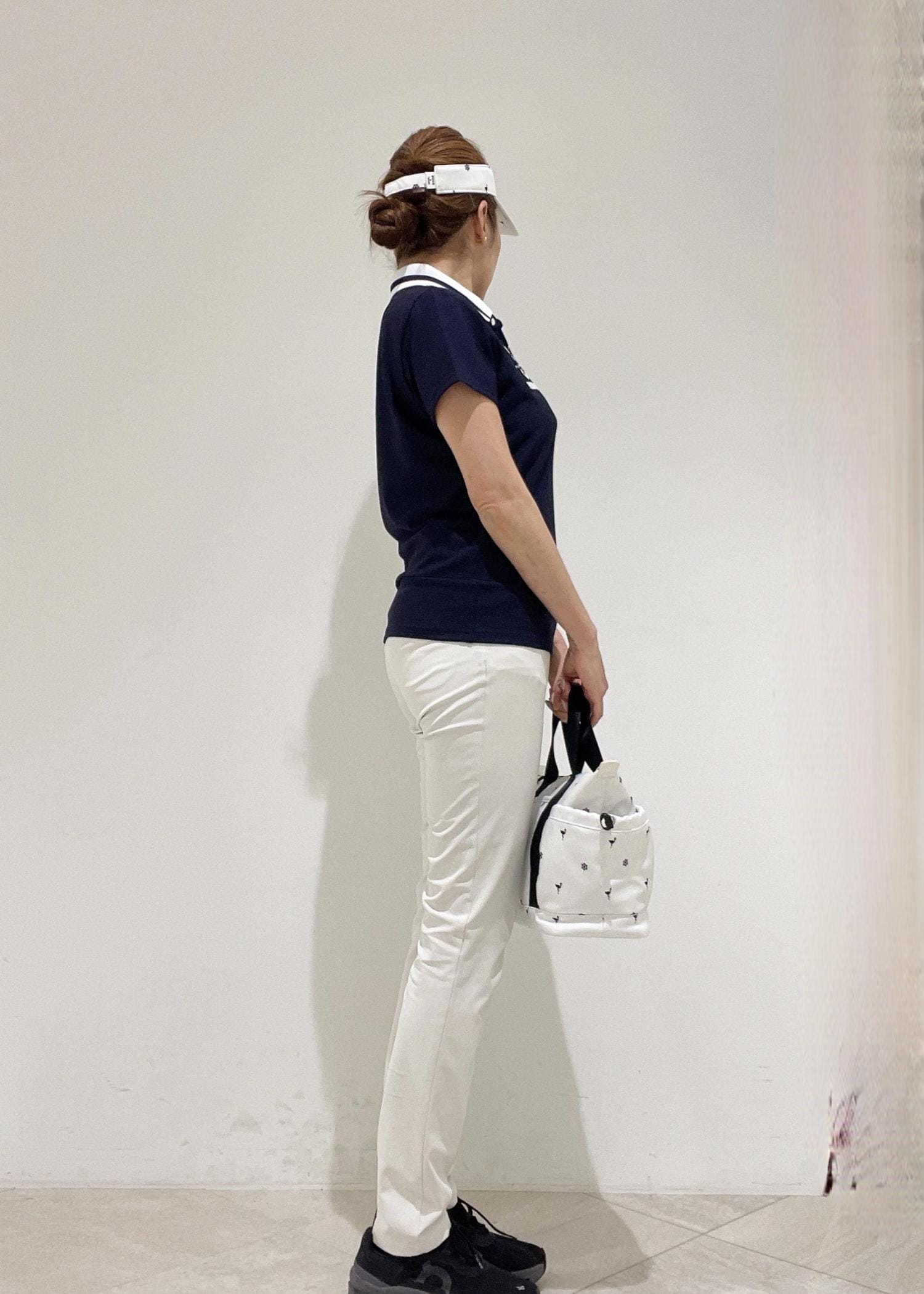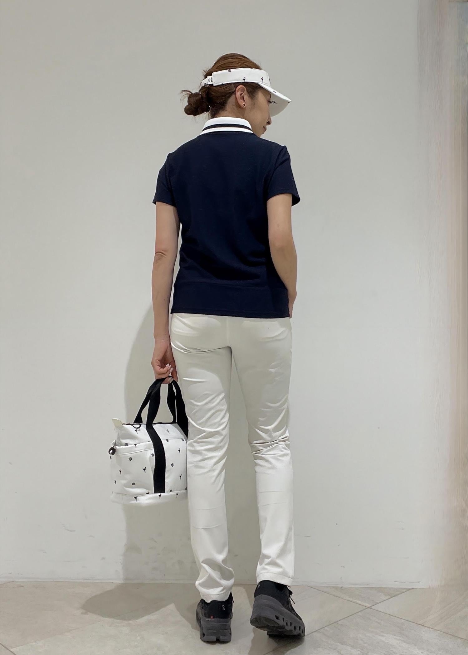 フラミンゴとマリンモチーフを組み合わせたコンビネーション柄のバイザーとバッグをプラス。コーディネートに遊び心と華やかさが加わり、夏らしいリゾート感のあるスタイリングに仕上がります。統一感のある柄使いで、スポーティーながら女性らしさも感じられる、大人のゴルフコーデです。