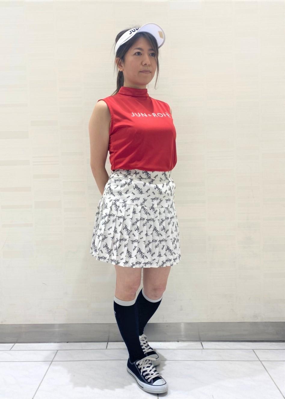 赤がポイントにした女性らしく華やかなコーディネート。プリーツスカートのトップスをノースリーブにする事でプリーツが際立ち女性らしさが強調されます。