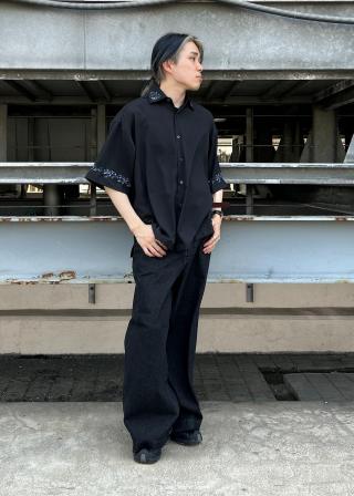 デザイン性が高いアイテムなのでトップはシンプルなシャツをタックイン。シルバーアクセを使い、ラグジュアリーなストリートスタイルが今っぽくかっこよく決まります。