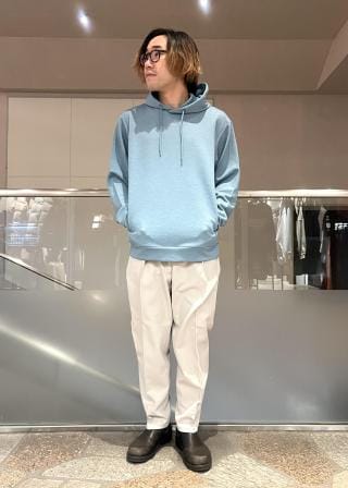 程よいハリと落ち感があるのでキレイなシルエットが表現でき、ナチュラルストレッチで着心地が良く、裏は微起毛加工をしているので暖かみのある素材です。