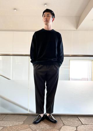 シンプルなトップスやシャツで合わせても股上に少しゆとりを持たせたシルエットなので特徴あるコーデになります。綺麗なシルエットなのでドレスカジュアルのジャケットコーデでビジネスシーンでも対応可能です。