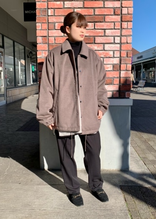 綺麗なツイル目と微光沢感が特徴的なポリエステルを使用。程よいハリと落ち感があるのでキレイなシルエットが表現でき、ナチュラルストレッチで着心地が良く、裏は微起毛加工をしているので暖かみのある素材です。程よいハリと落ち感があるフラットな表面が特徴です。伸縮性も兼ね備えているので着心地が良い素材です。