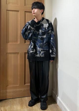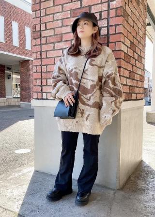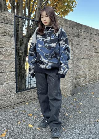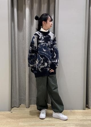 トレンド感のあるマーブル柄のデザインなので、ワイドパンツやダウンジャケット・コート系などのインナーに合わせたコーディネートがオススメです。