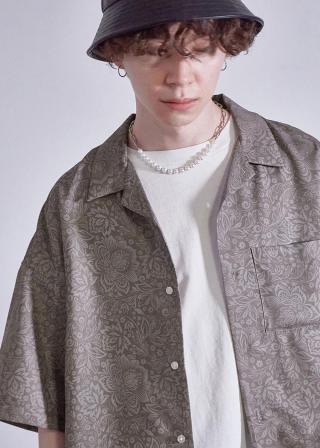 植物感の強いペイズリー柄をトーンオントーンで総柄プリントし、ルーズシルエットでありながら首元が開き過ぎないオープンカラーでキレイめな印象に。