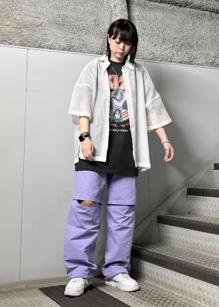 明るい半袖TEEとのレイヤードにしインナーカラーを楽しめるスタイリングがトレンドらしく決まります。