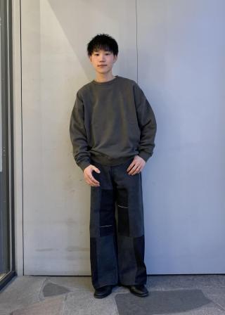 身幅や肩幅など今っぽいリラックス感のあるオーバーサイズでありながら着丈や袖幅などを出しすぎず、野暮ったくないこなれ感のあるボックスシルエットであえて首元や裾を絞りすぎないことで程よい抜け感のあるクルーネックスウェットです。製品染め特有のステッチや切替箇所が着込んだようなあたりが出たヴィンテージ感のある表面にY2Kテイストのフォントで表現したグラフィックを同色系でプリント。