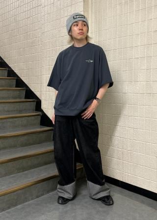 インパクトのあるフロントプリントで一枚で決まるデザインなので、ワイドデニムと合わせたシンプルコーデがおすすめです。