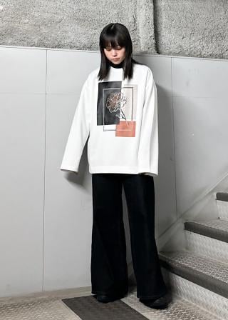 アートフラワーを重ねて立体感を出しています。また異なる手法を組み合わせ表情豊かで一枚でコーデが決まります。ワイドスリーブシルエットなので単品でもスタイリングを楽しめます。
