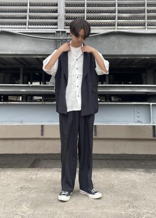また同素材のパンツと合わせたセットアップとタックインコーデを合わせたモードでクリーンな印象に仕上がります。