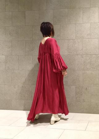 全体的にゆったりとしたサイズ感ですがアンダーバスト部分にギャザーを寄せていることでシェイプ見えするボディラインを拾わないロング丈のドレスです。