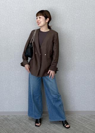 ノーカラーの首元からフリルブラウスを覗かせれば、より一層フェミニンで洗練された印象に仕上がります。