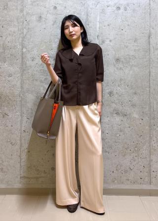 麻調合繊のブラウスや同素材のパンツと合わせた、涼やかで上品なセットアップスタイルがおすすめ。