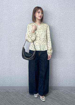 太めのワイドシルエットですが、腰回りがすっきりしておりセンタープレスも効いているので、綺麗めにも履けるデニムパンツです◎