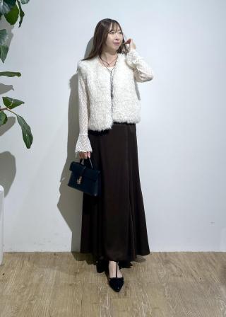 足首ぐらいの着丈で、高身長でもきやすい着丈です。光沢のある生地がカジュアルすぎないので色々なテイストに合わせやすいですよ。