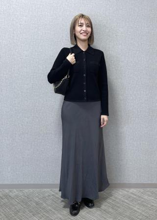サテンスカートやタイトスカートと合わせが◎第一ボタンを外すと、抜け感と華やかさがプラスされて女性らしい印象になります。
