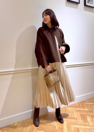 プリーツスカートやストレートシルエットのスカート、パンツともバランスよく合わせられるサイズ感に仕上げています。