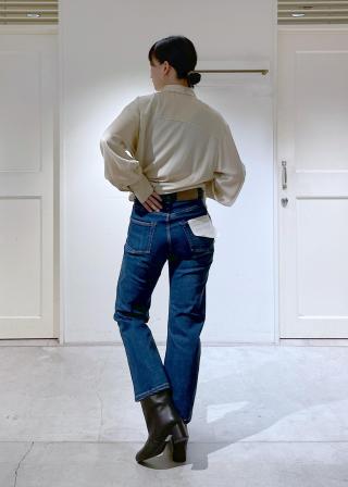 ツヤ感のある素材は、デニムなどカジュアルボトムとのスタイリングも◎