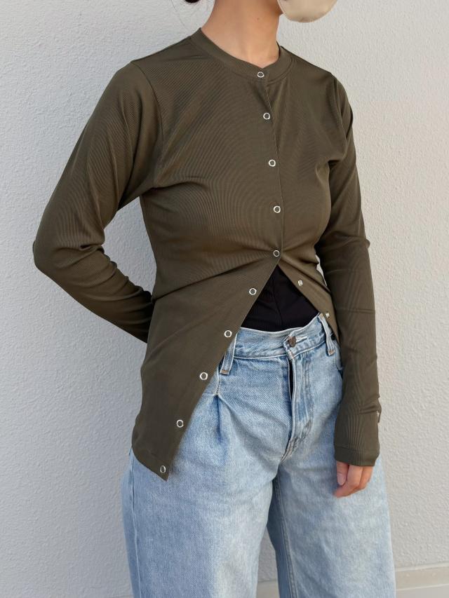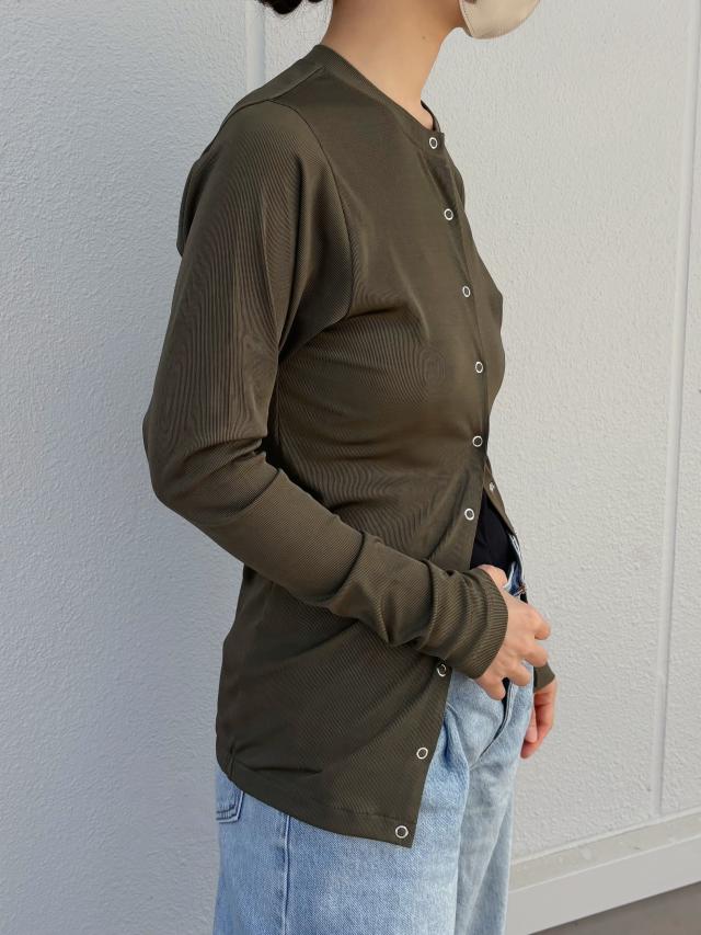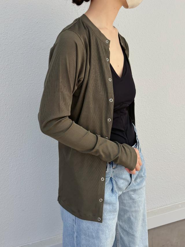 シーンを選ばないカラーバリエーションと、透け感のない滑らかなリブ素材が、シンプルながらも上品な大人カーディガン。通気性がよく風を通すので、ピタッとフィットしたシルエットでも暑すぎず快適に着られます。