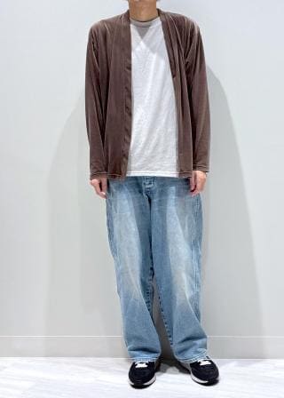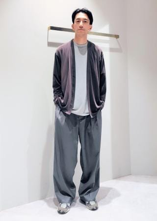 ・アウターはノーカラー仕様で、シンプルながらもリラックス感のあるデザイン