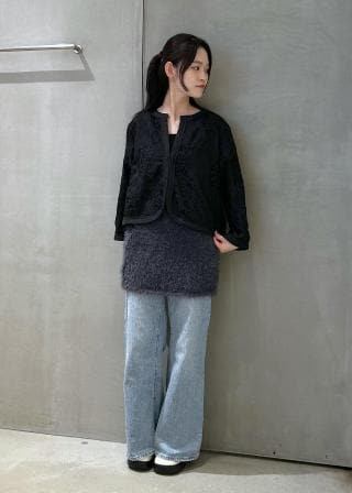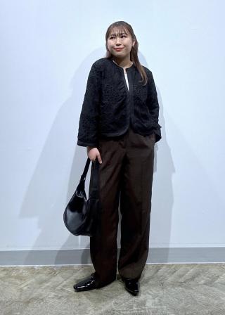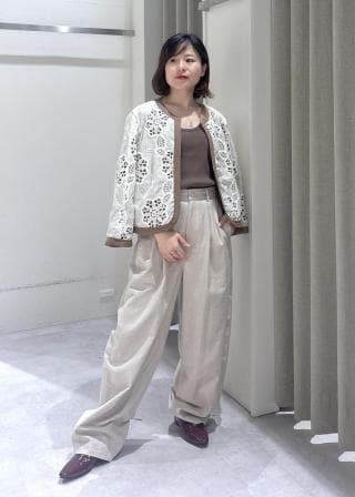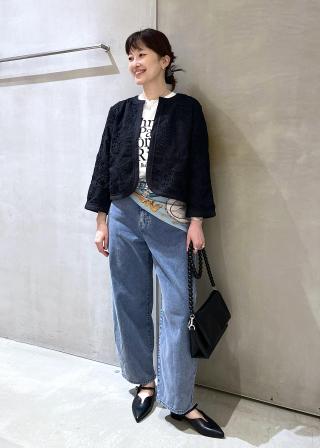 ハンドメイド風のレース刺繍の入ったショートジャケットです。凹凸のある表情のあるレースで、きれいめにもカジュアルにも合わせやすいです。164cmが着用すると腰骨上くらいの着丈でした。