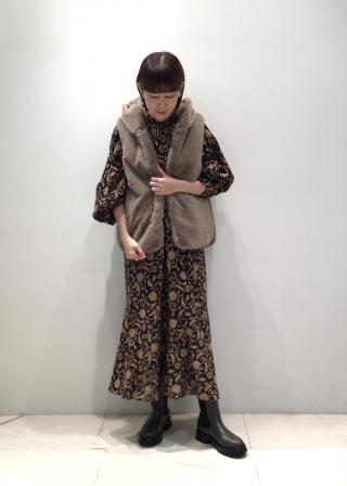 フロントホック開きで、フード付きのようなシルエットで顔周りにボリュームのあるファーベスト。