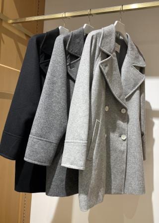 お尻がかくれる丈感と衿を3通りに表情が変えられるピーコートタイプのコート。スカートでもパンツでもバランス良く合わせられます。