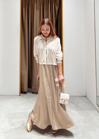 クロップド丈のニットポロシャツと、程よい光沢感のサテンキャミワンピースがセットになったアイテム。