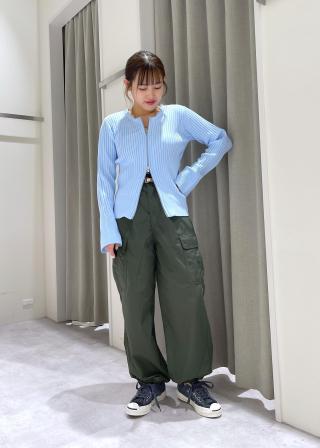 ゆるっと裾にたまるカーゴパンツですが、腰回りはすっきりしたデザインなので、着太りせず来ていただけます◎
