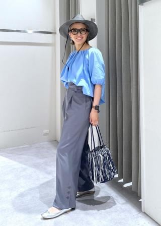 ウエスト部分は折り返して着用することもできるので気分やスタイリングに合わせて履いていただけます。 裾にボタン開きがあり、ボタンを開けていただくとスリットのようになります。 タックとセンタープレスで女性らしいマニッシュな印象のパンツに仕上がっています。