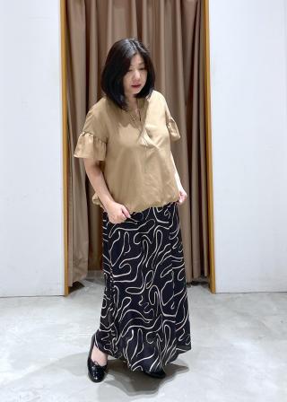 裾が絞れるようになっているのでスタイリングによって調節できます。ギャザーの入ったフレアスリーブが腕を細く見せてくれるのもうれしいポイント。