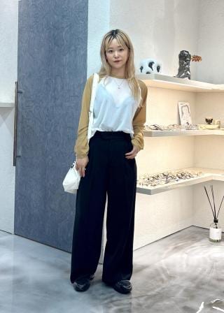 太めなシルエットのパンツなので、ニットベストやショート丈のシャツに合わせると、きれいなパンツラインを活かしてスッキリ着こなせます。