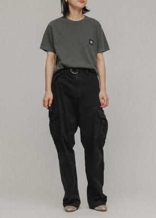ビンテージ感のある風合いで洗いのかかった後染めのTシャツを使用し、ムウのロゴラベルがファブリックに際立ち、アイコニックなアクセントを添えています。
