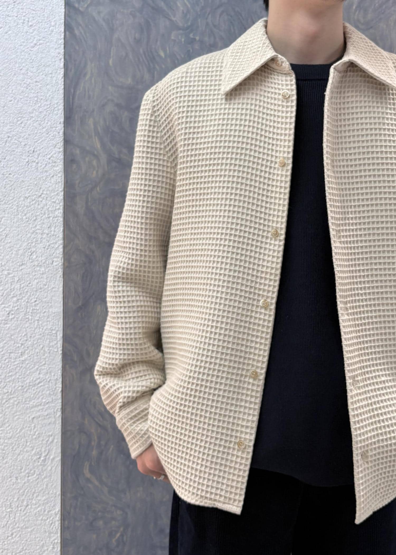 シャツ型ですが、ワッフルのような肉厚で凹凸のあるアイテムで今の時期の日中は羽織として、夜はこの上にカーディガンやアウターを着れる優れものでおすすめです。