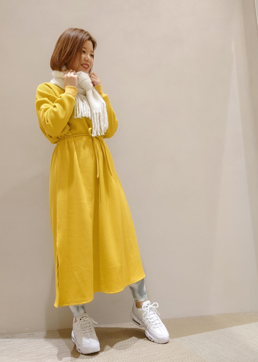 新作のワッフルワンピースの黄色を着用しました♡ 寒くなってきて、暗い色味の服を選びがちですが 明るいカラーを着るとやっぱりテンションがあがります♬ 裏起毛になっているのでしっかり暖かいのも嬉しいポイントです! タイツも雲をイメージした柄で、とっても可愛くて着心地も抜群でオススメです! 商品のお問い合わせなど、是非お気軽にメッセージくださいませ! お得な情報も配信中! LINEでららぽーとEXPOCITY店スタッフに相談は【友達だち追加】をタップをして下さい