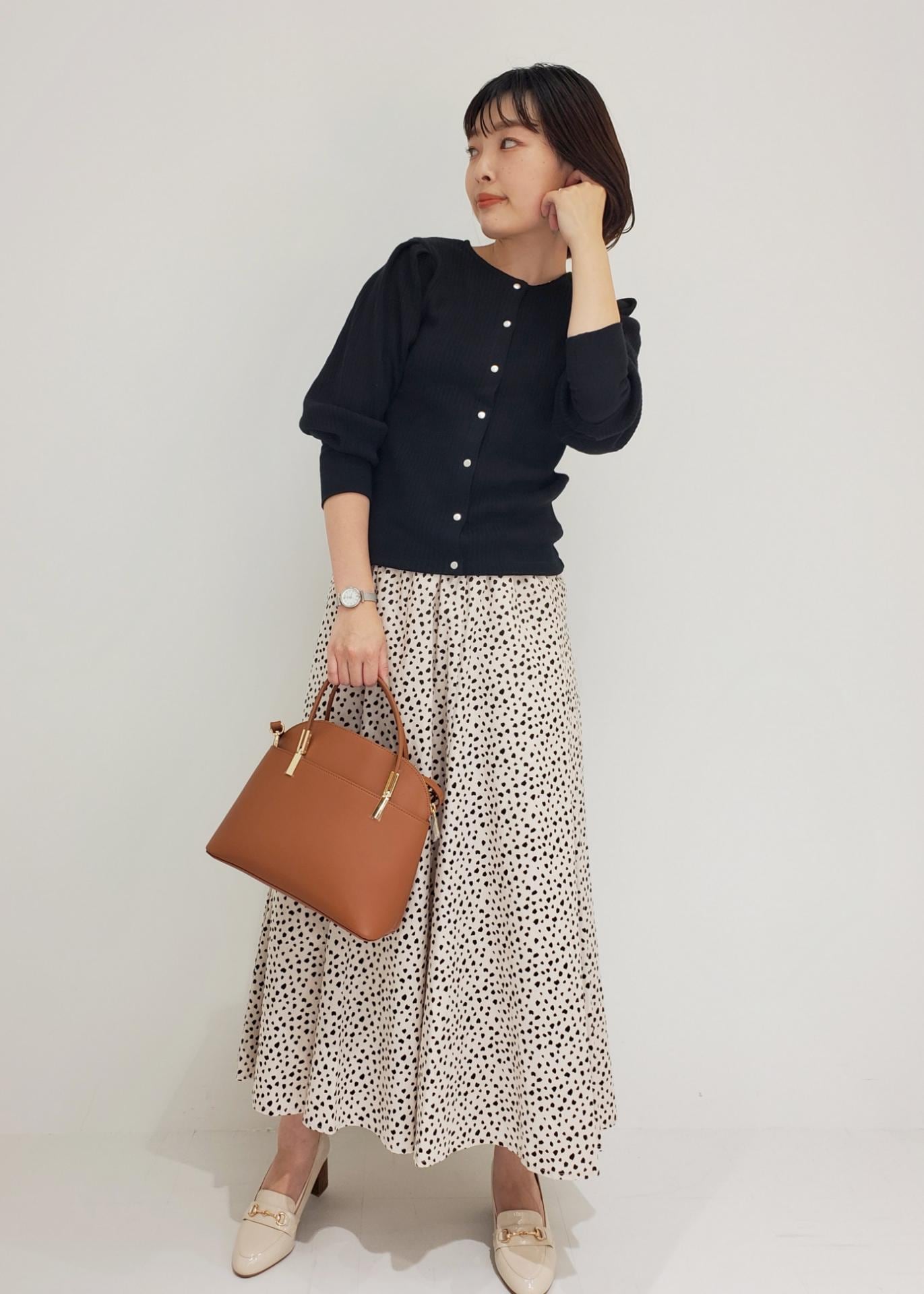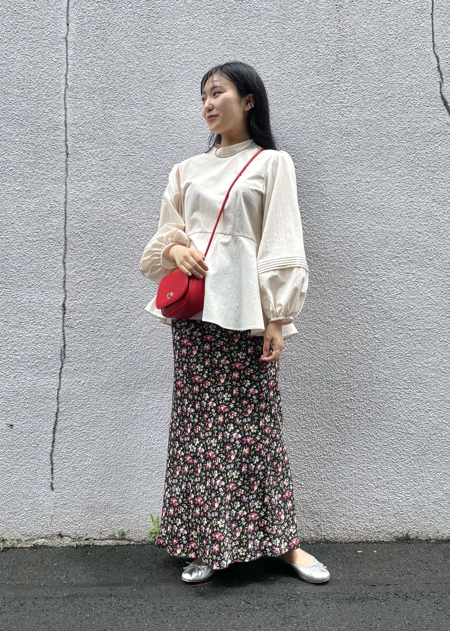 MADEMOISELLE定番の花柄ロングスカートできれいめコーディネートに。ボリュームのあるトップスでもスタイルアップが叶います