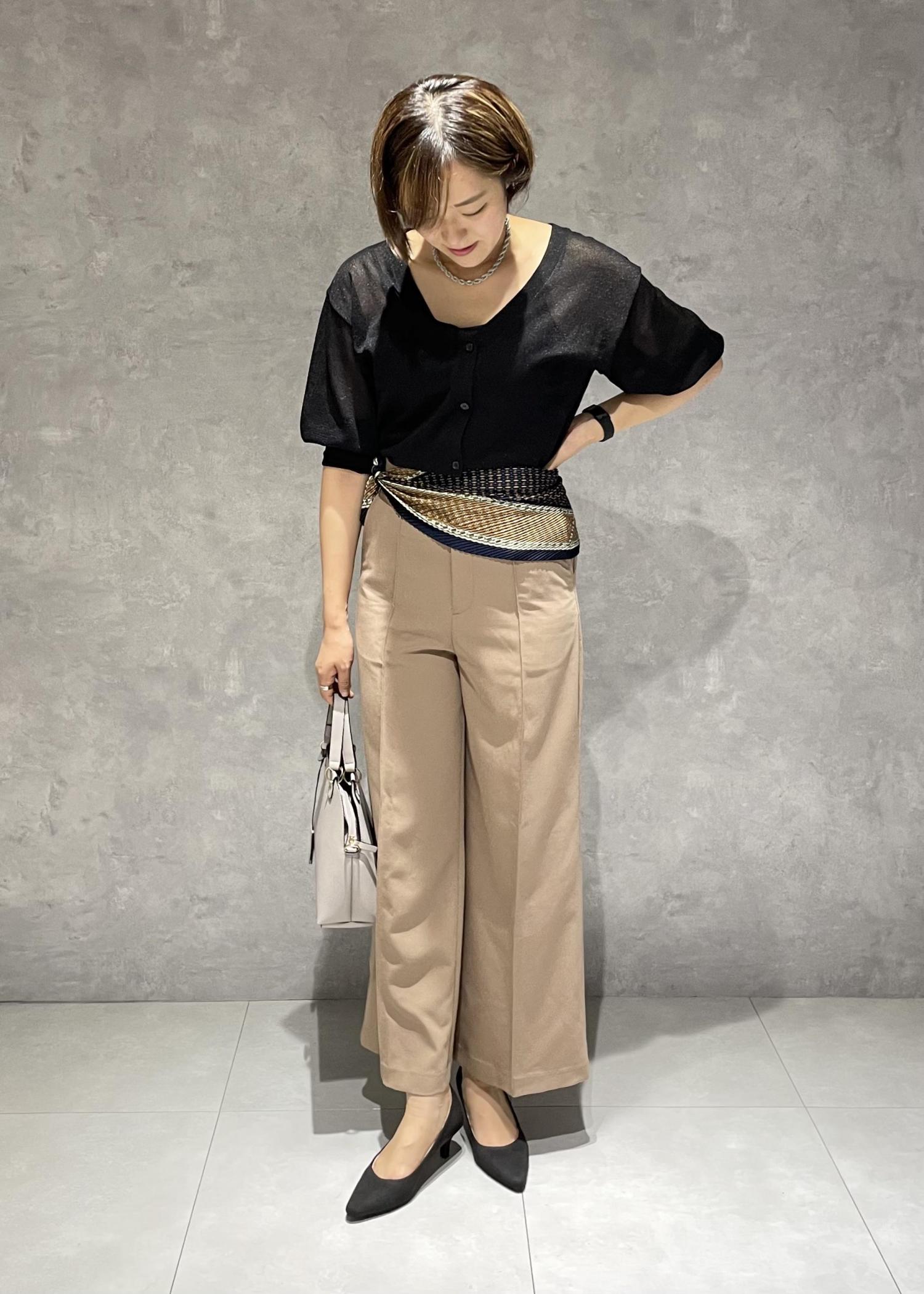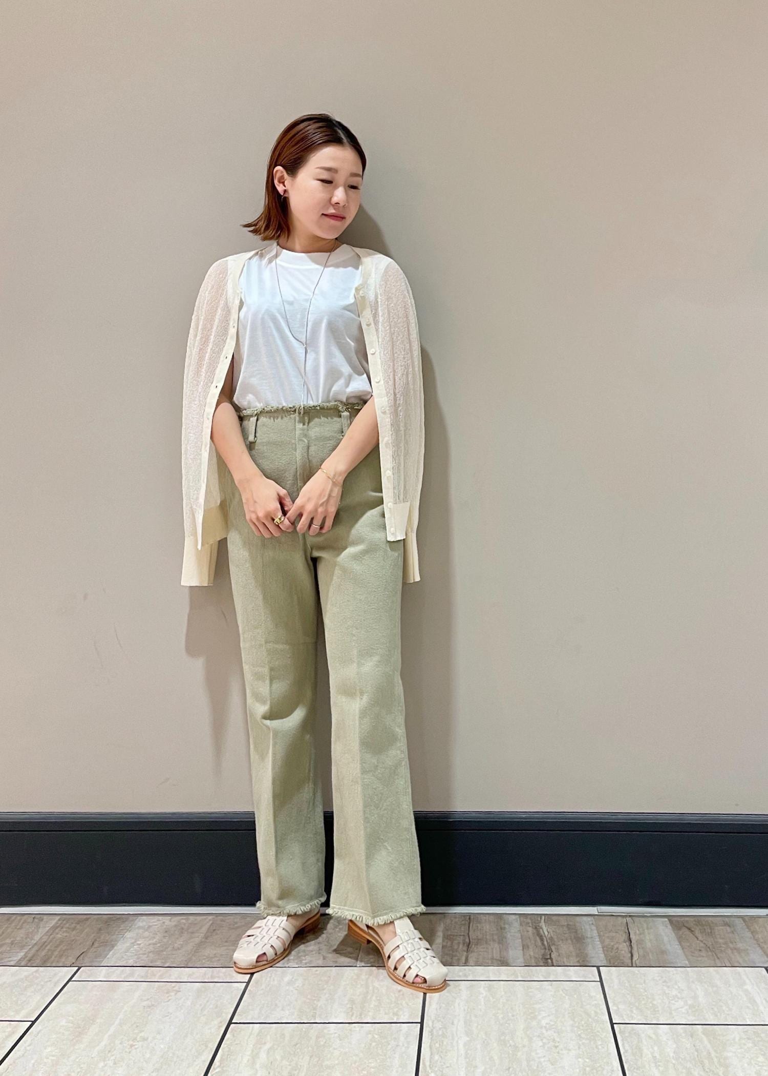 Tシャツはニットパンツで新しさをプラス。Tシャツだけだとワンツーコーデでシンプルにまとまってしまうので、ニットパンツはセットアップのカーディガンと合わせてキチンと感もプラスして。