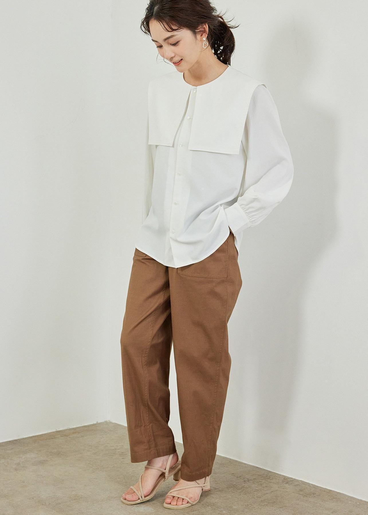 ハイウエストのスラックスは腰回りのシルエットに沿うスタイルアップパンツ。お腹周りをケアし脚長に見せてくれるハイウエストで毎日でも履きたくなるパンツです。
