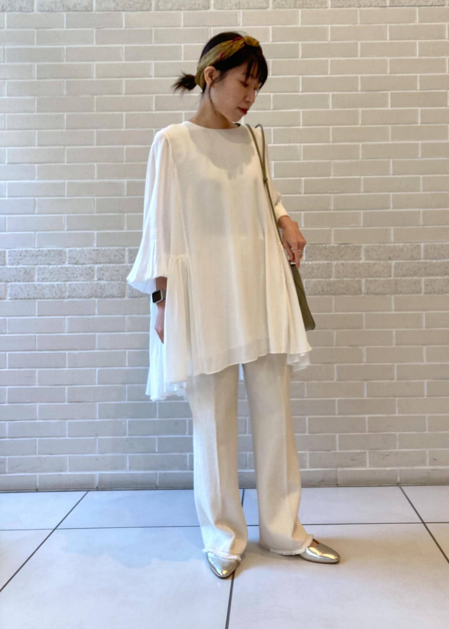 足元はホワイト系のフラットシューズで明るくまとめました。