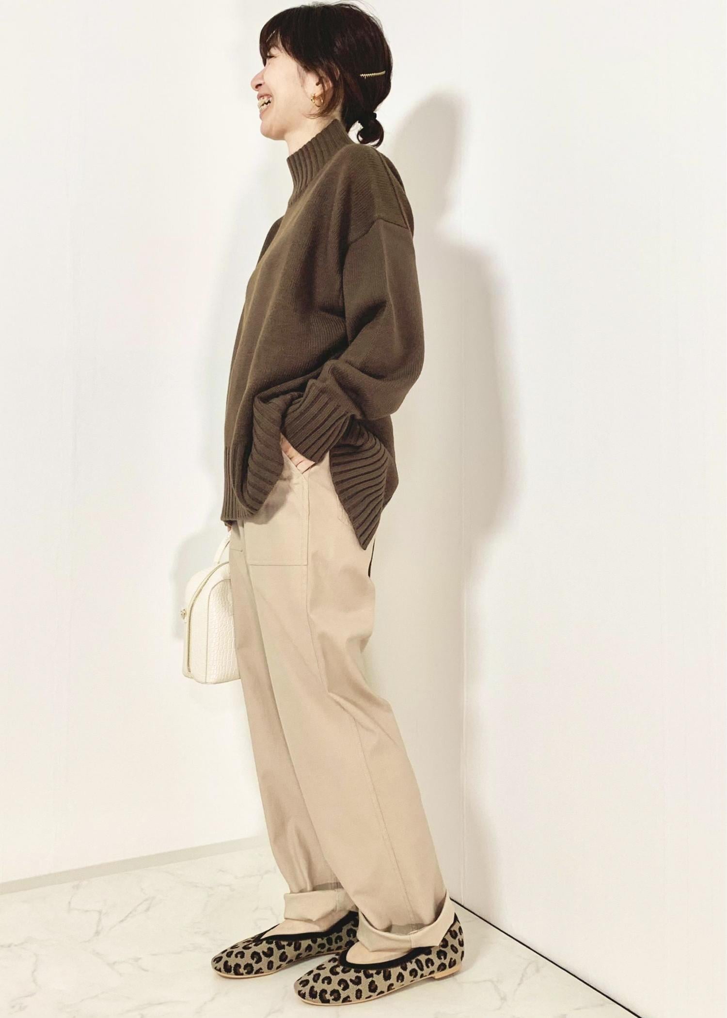 オリーブとレオパードを合わせて色の統一感を意識してコーディネート。ニットカーデはショート丈なので、バランスの良いコーデに
