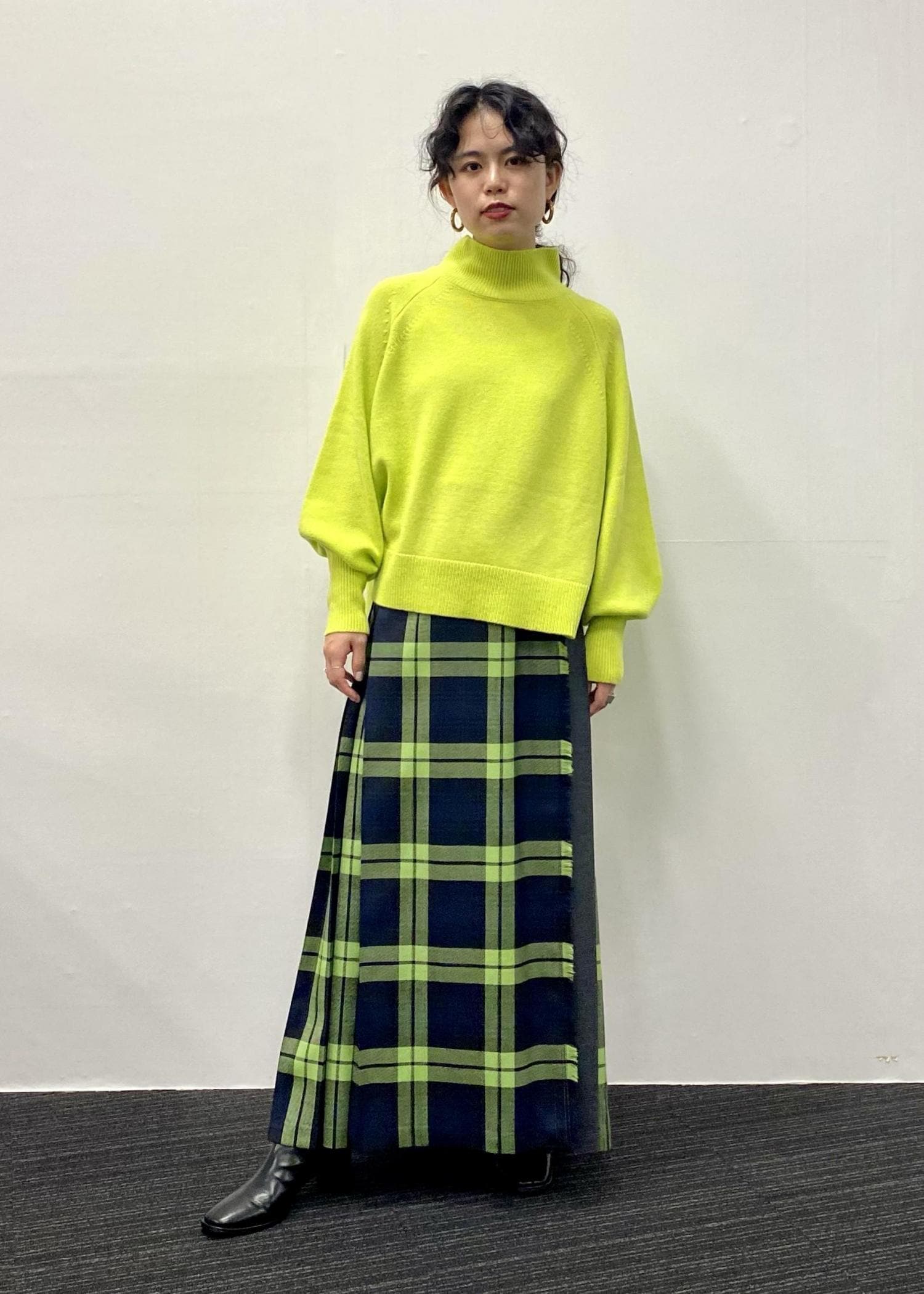 低身長でも合わせやすいコンパクトな着丈が毎年人気なニット。ボリューム袖が叶えてくれる旬シルエットが魅力のカラーニットコーデです。