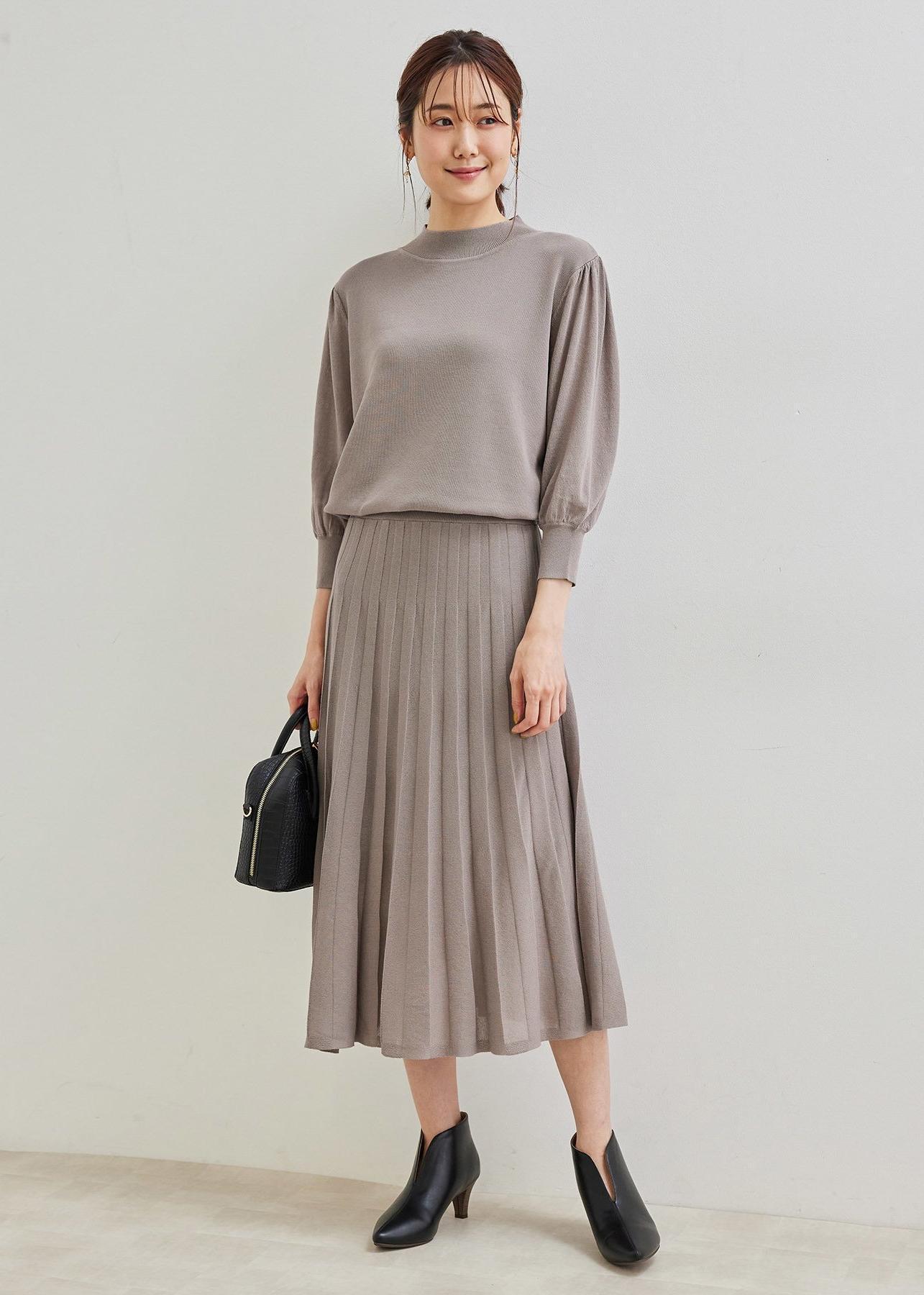 人気のニットプリーツワンピースの新作は、袖が少しシアー感がありメリハリのあるシルエット。