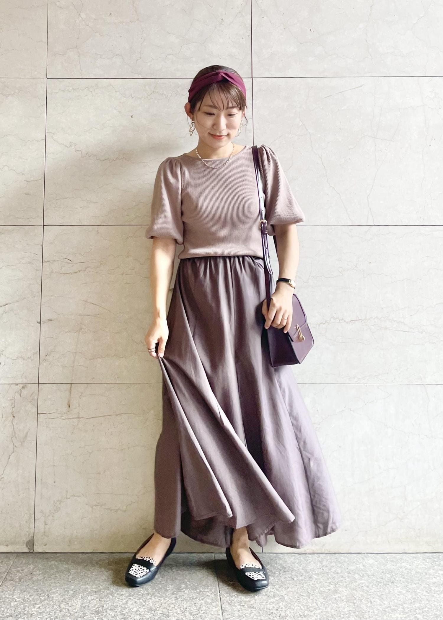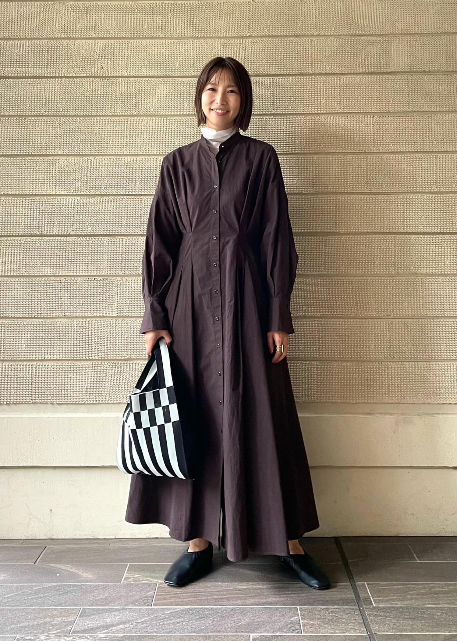 これだけでコーデが完成する美短ワンピーススタイリングです。柔らかなブラウンの微配色が上品さを演出してくれるので、その雰囲気を壊さないよう同系色の小物を合わせて。