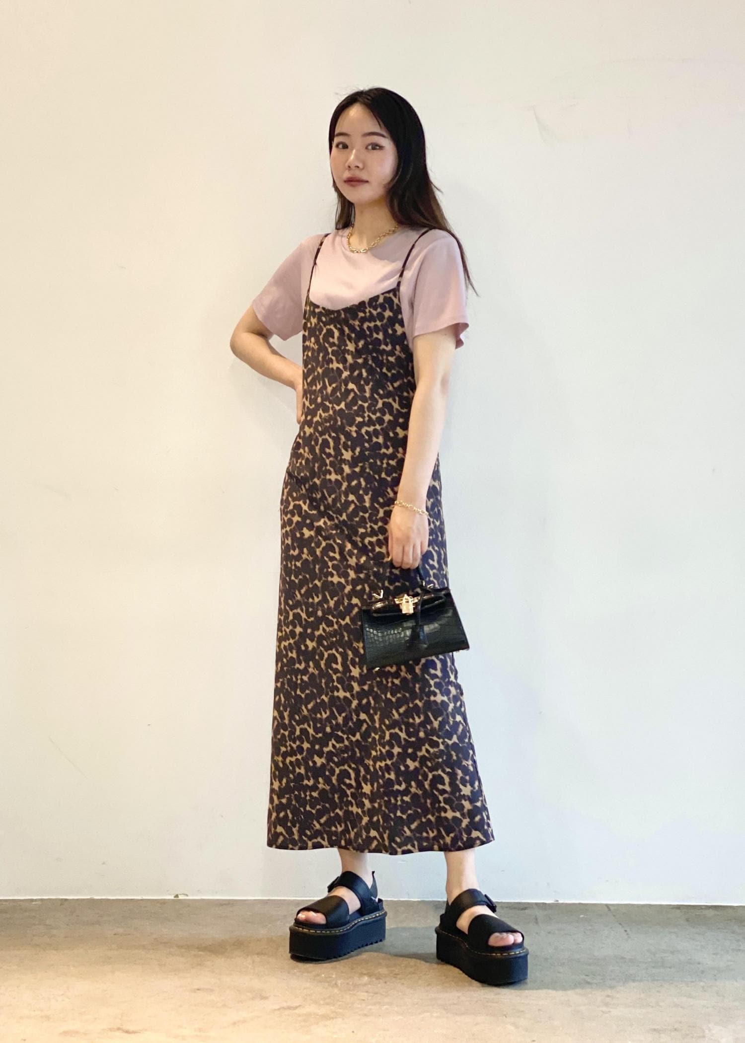秋は柄から!強い印象になりがちなレオパードをピンクのTシャツで甘めに落とし込みラフスタイルに。小物はブラックで絞めつつ、サンダルで抜け感を。